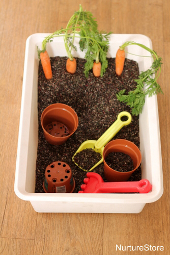 Com bé sabeu les activitats sensorials són de vital importància pel desenvolupament cerebral, motriu i emocional dels infants. L‘activitat que us proposem consisteix a construir un petit hort, podeu utilitzar arròs tenyit amb colorant alimentari, llavors, pa ratllat, serrin o bé terra i després haureu d’afegir alguna verdura com poden ser pastanagues, patates o raves i algun element de plantació com pot ser pales, testos, regadores, etc. De ben segur que gaudiran omplint i buidant els testos i enterrant i desenterrant les verdures.